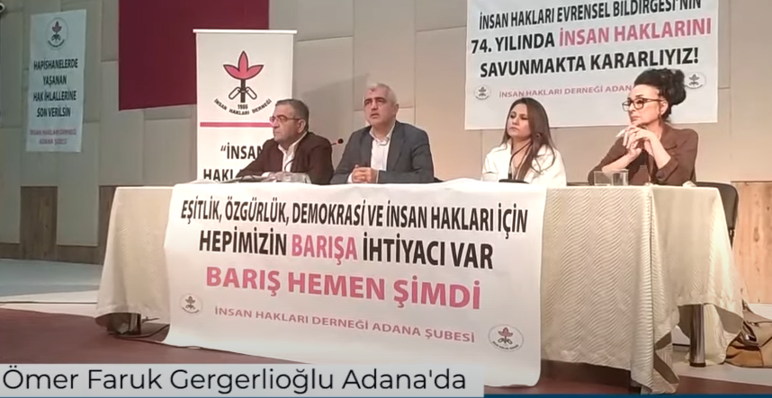 Adana’da İnsan Hakları Derneği tarafından İnsan Hakları Paneli düzenlendi. Panele HDP Milletvekili Ömer Faruk Gergerlioğlu, CHP Milletvekili Sezgin Tanrıkulu ve İnsan hakları Savunucusu Eren Keskin katıldı. Panelde Türkiye son dönemde yaşanan insan hakkı ihlalleri masaya yatırıldı. Panelde konuşan Ömer Faruk Gergerlioğlu KHK’lıların yaşadığı insan hakkı ihlallerine değindi.